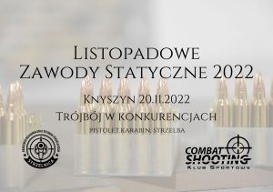 Listopadowe Zawody Statyczne 2022 – formuła zawodów zawiera się w trzech konkurencjach (pistolet, karabin i strzelba). Karabin centralnego zapłonu – 25 m Pistolet centralnego zapłonu – 15 m Strzelba – 15 m – Wynik sumowany do klasyfikacji ogólnej – Regulamin zawodów dostępny na stronie www.combatshooting.pl – Zawody strzeleckie wpisane do kalendarza WZSS co sprawia, że…