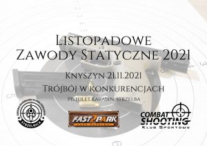 Listopadowe Zawody Statyczne 2021 – formuła zawodów zawiera się w trzech konkurencjach (pistolet, karabin i strzelba). Karabin centralnego zapłonu – 25 m Pistolet centralnego zapłonu – 15 m Strzelba – 15 m – Wynik sumowany do klasyfikacji ogólnej – Regulamin zawodów dostępny na stronie www.combatshooting.pl – Zawody strzeleckie wpisane do kalendarza WZSS co sprawia, że…